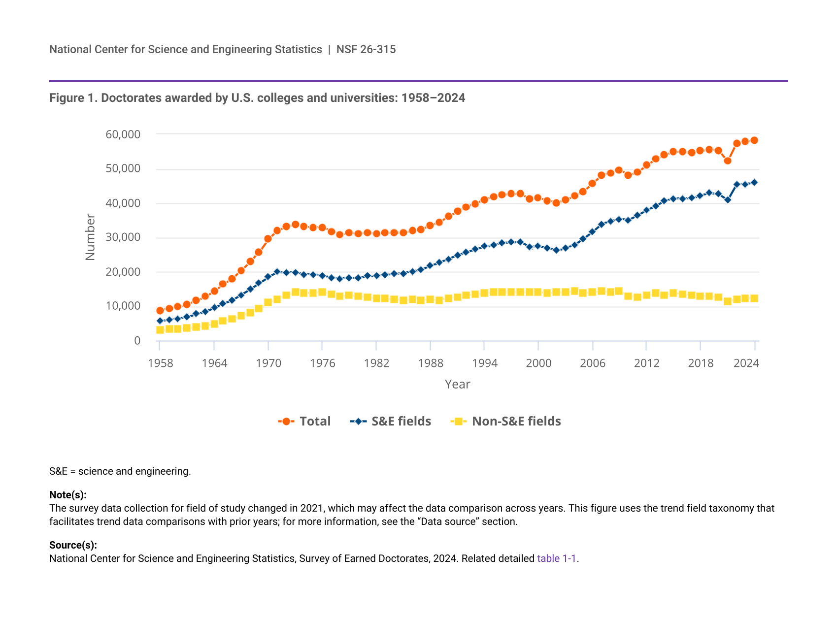 The number of research doctoral degrees awarded by U.S. institutions increased from 57,806 in 2023 to 58,131 in 2024 (figure 1). This increase is similar to the increase between 2022 and 2023. Since the Survey of Earned Doctorates (SED) began collecting data in academic year 1958, there has been an upward trend in the number of doctorates awarded by U.S. institutions—with an average annual growth of 3.0%, punctuated by periods of slower growth and some declines.