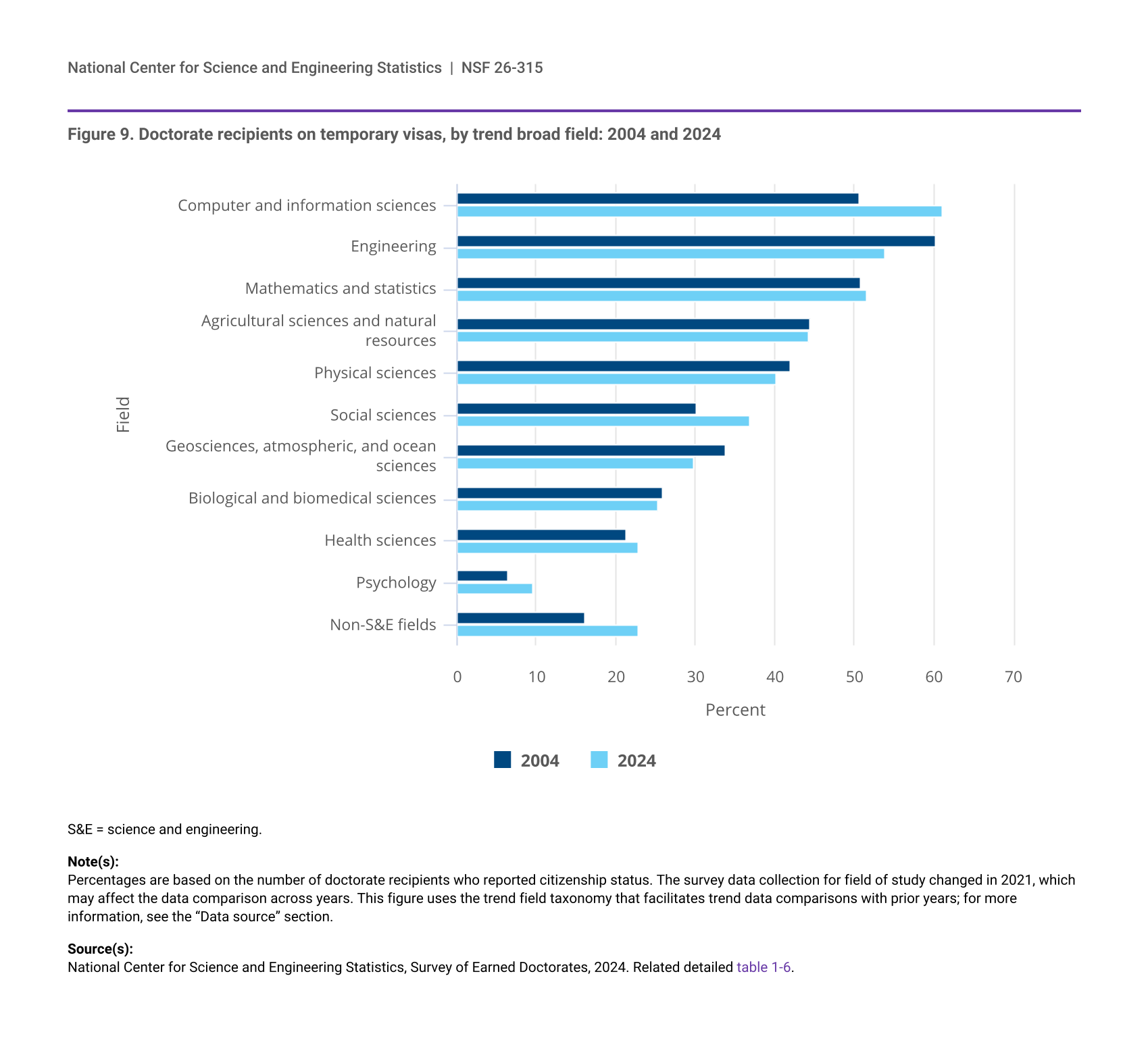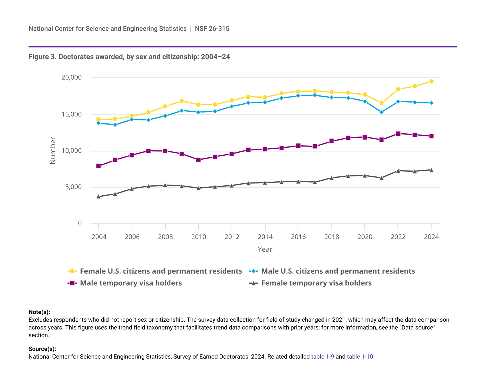 In 2024, U.S. institutions awarded 45,929 total S&E doctorates. Of the 43,942 S&E doctorate recipients who reported their citizenship, U.S. citizens and permanent residents earned 27,204 (62%) of the S&E doctorates, an increase of 600 from 2023. Temporary visa holders earned 16,738 (38%), a slight decline of 27 from 2023 (figure 2). Over the past 20 years, the average proportions of U.S. citizens and permanent residents and temporary visa holders earning S&E doctorates from U.S. institutions has remained stable at 62% and 38%, respectively. Overall, the number of S&E doctorates awarded to temporary visa holders has increased by 76% since 2004 and by 22% since 2014. Over the past 20 years, the proportion of S&E doctorates awarded to temporary visa holders peaked at 41% in 2007, declined to 35% in 2010, held steady at about 36% between 2011 and 2017, and grew to 39% through 2020, where it remained about the same through 2024. Starting from a larger base, the number of S&E doctorates awarded to U.S. citizens and permanent residents experienced a slower relative increase over the past 20 years (61% since 2004 and 14% since 2014) compared with the increase in S&E doctorates awarded to temporary visa holders.