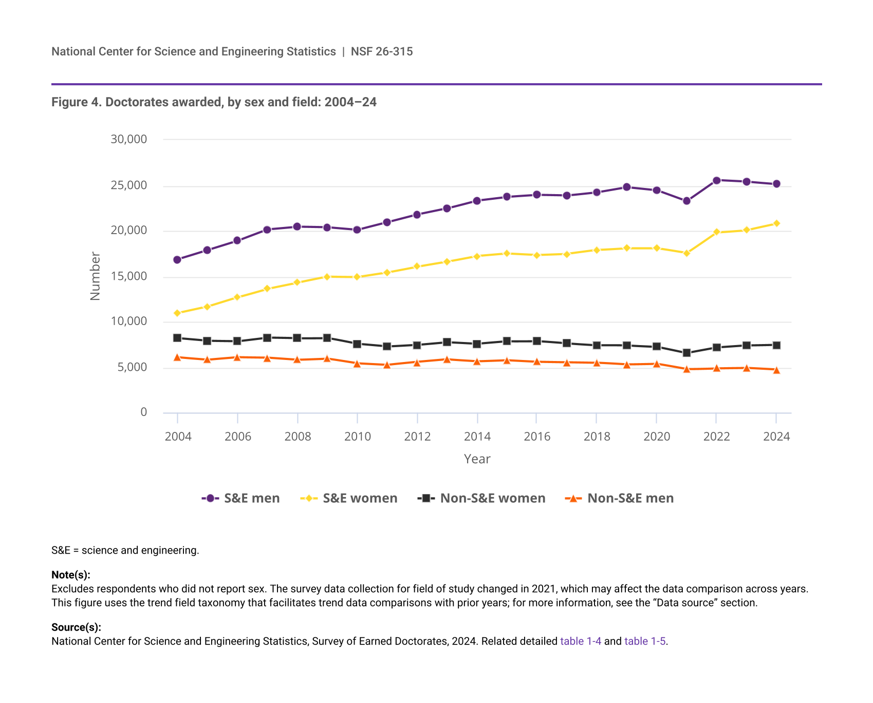 In the past 20 years, all of the growth in the number of doctorates earned by both men and women has been in S&E fields (figure 4). During this period, the number of female doctorate recipients in S&E fields increased by 89% (from 10,969 in 2004 to 20,782 in 2024), compared with a 49% increase in the number of male S&E doctorate recipients (from 16,872 in 2004 to 25,146 in 2024). The proportion of female doctorate recipients in S&E increased from 39% in 2004 to 42% in 2009, remained fairly stable through 2019, and increased to 45% by 2024. While the proportion of female doctorate recipients in non-S&E fields has always been higher than that in S&E fields, the proportion of women earning non-S&E doctorates hovered at about 58% through 2021 and grew to 61% by 2024. In the past 20 years, the number of doctorates in non-S&E fields awarded to men declined by 22% (from 6,093 in 2004 to 4,739 in 2024), and the number awarded to women declined by 9% (from 8,186 to 7,463).