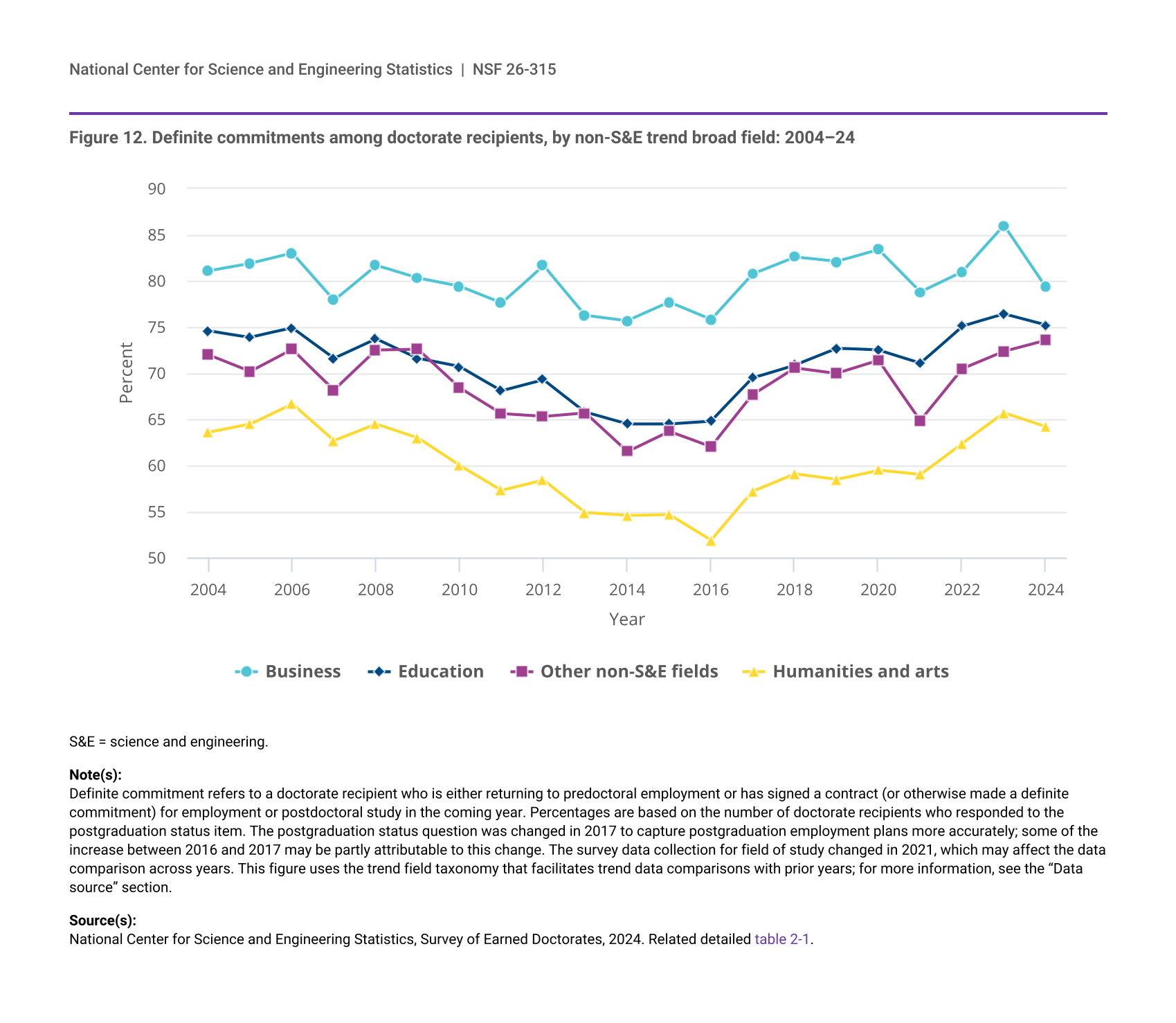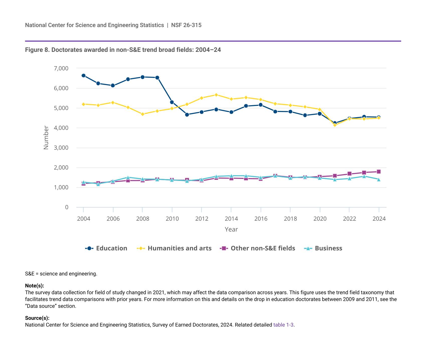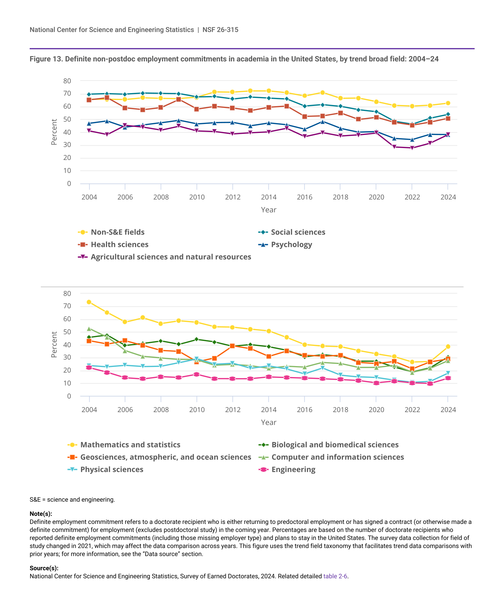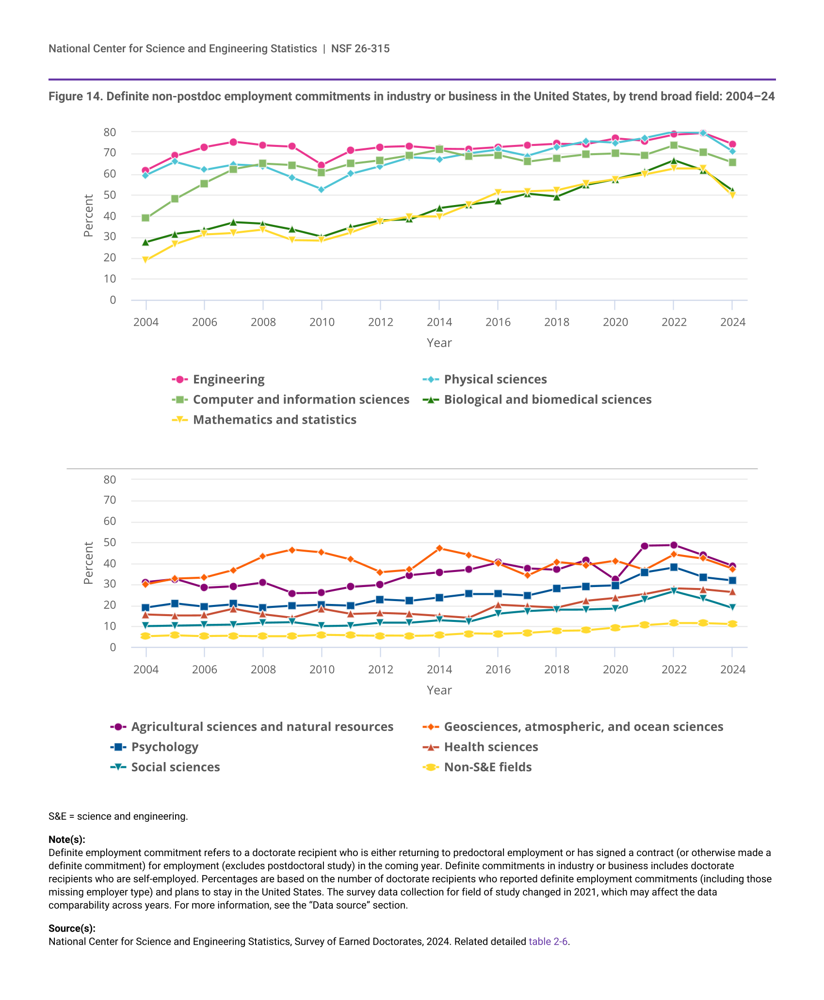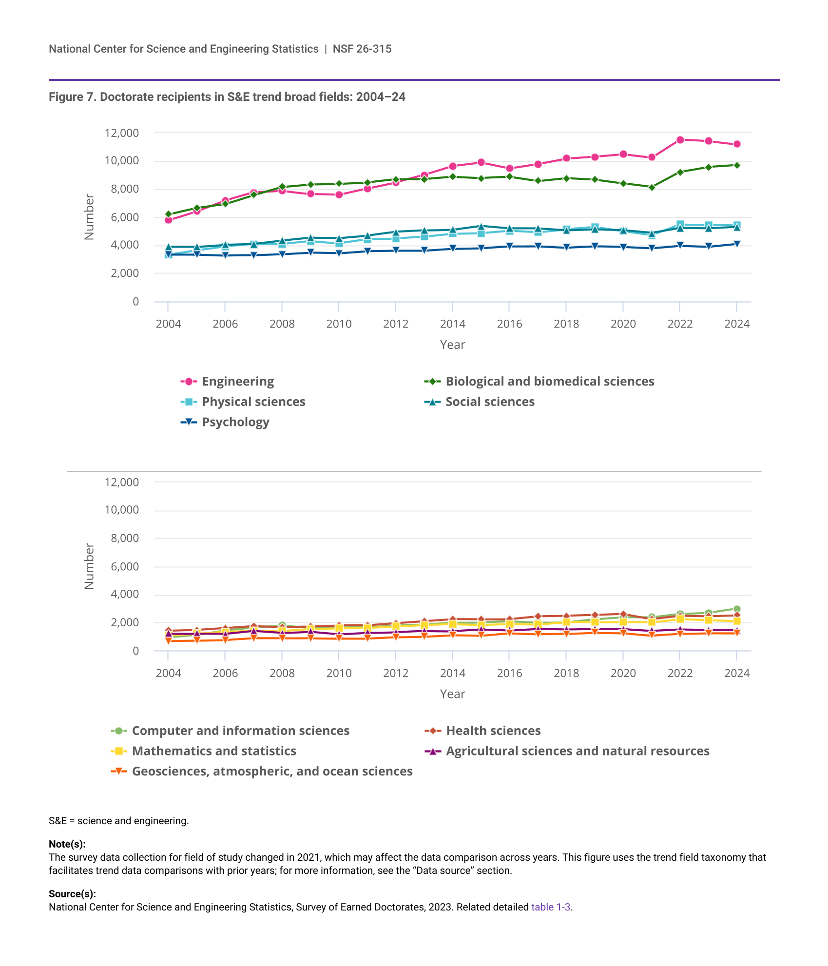 The survey data collection for field of study changed in 2021, which may affect the data comparison across years. This figure uses the trend field taxonomy that facilitates trend data comparisons with prior years; for more information, see the “Data source” section.
