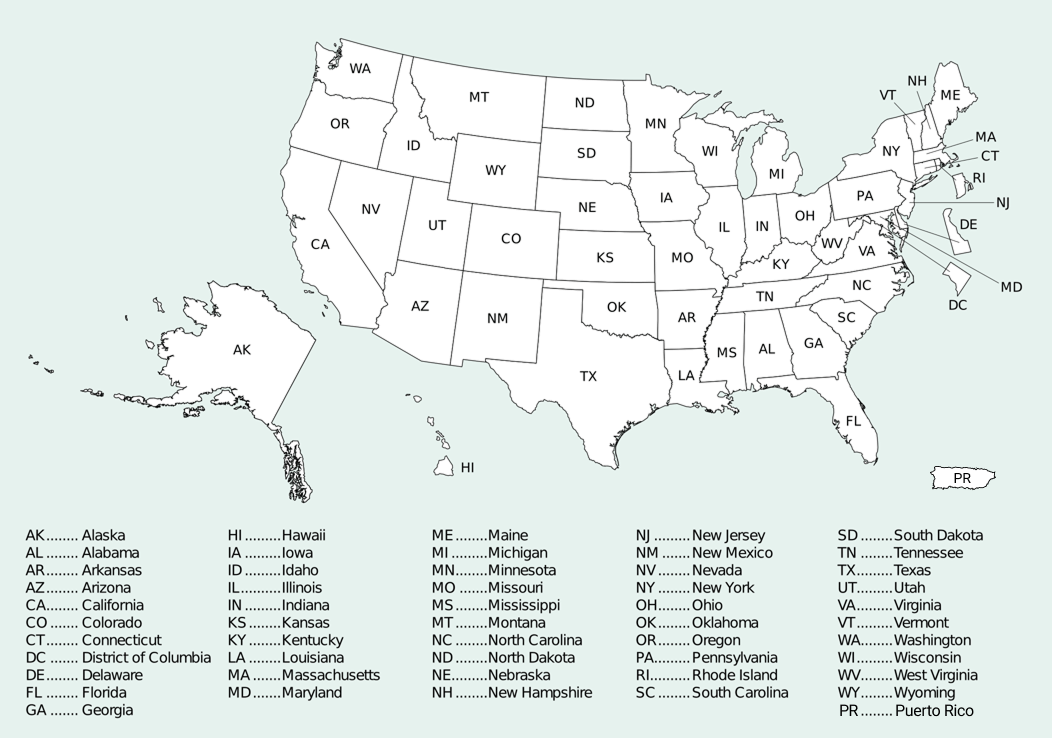 The State Indicators data tool includes over 50 principal indicators for the United States, individual states, the District of Columbia, and Puerto Rico (when available). Figure S-A below shows the geography of U.S. states and territories that are included in the State Indicators data tool. Certain indicators are also available by county. The data used to calculate the indicators are gathered from public and private sources. State Indicators are updated periodically, as new data become available.