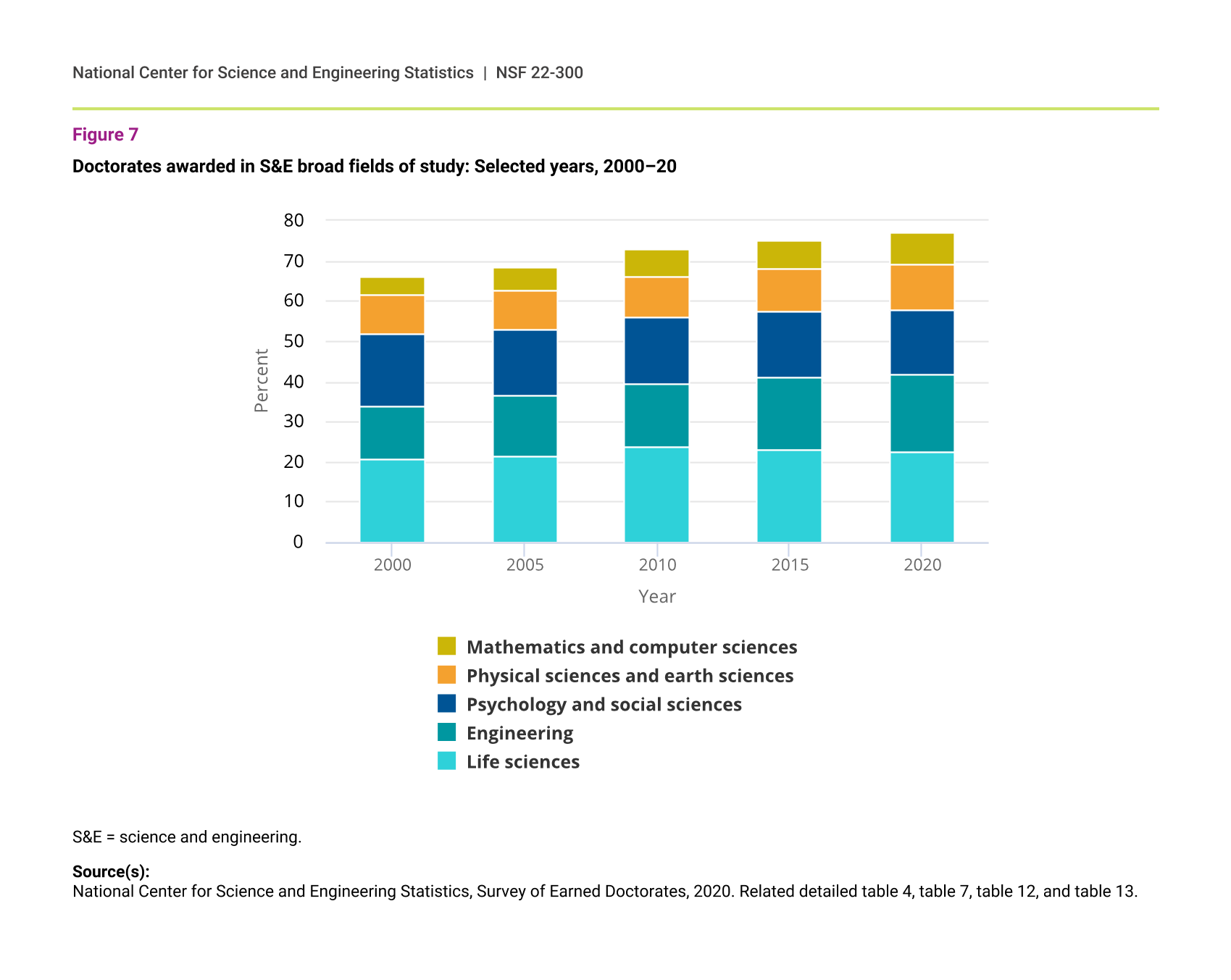 Doctorates awarded in S&E broad fields of study: Selected years, 2000–20