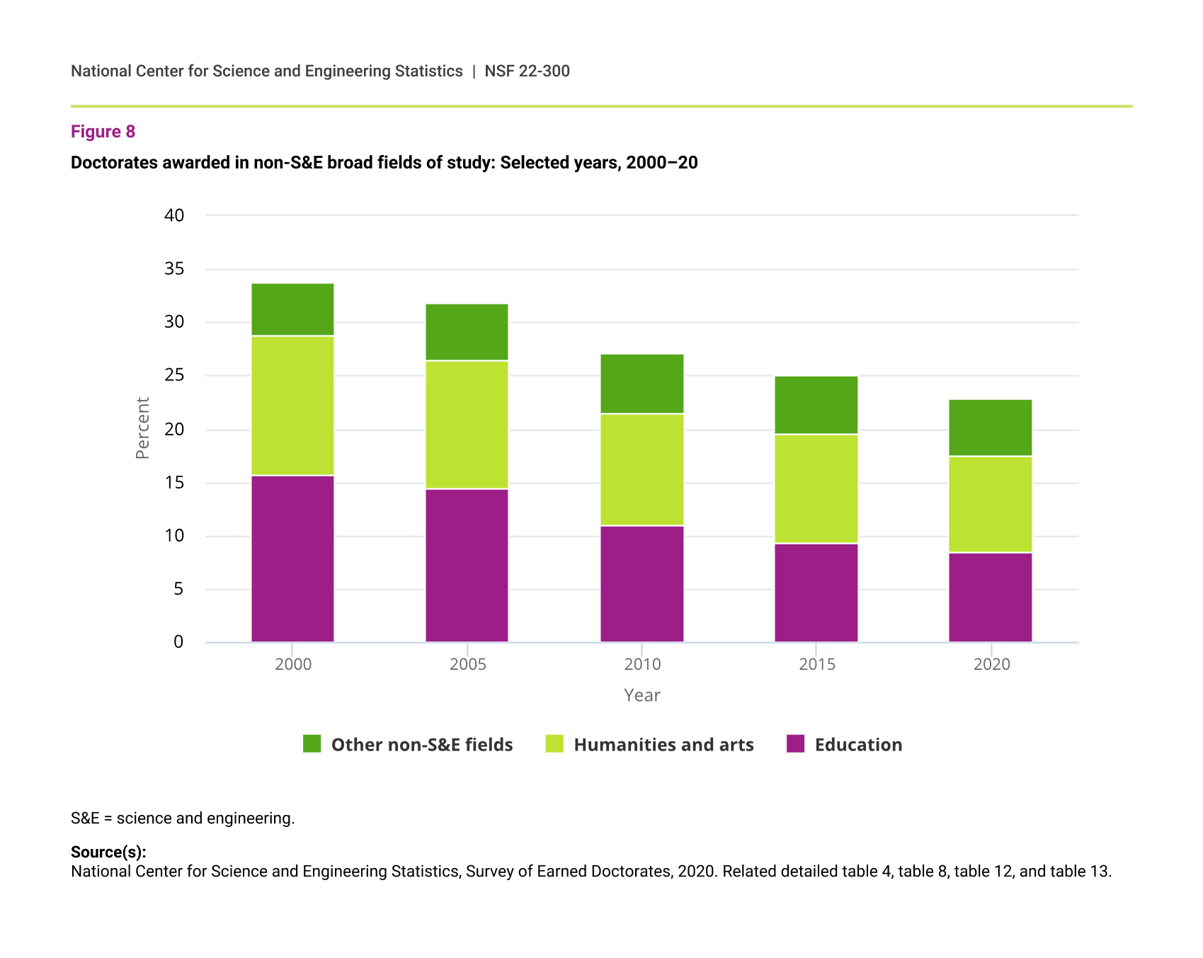 Doctorates awarded in non-S&E broad fields of study: Selected years, 2000–20