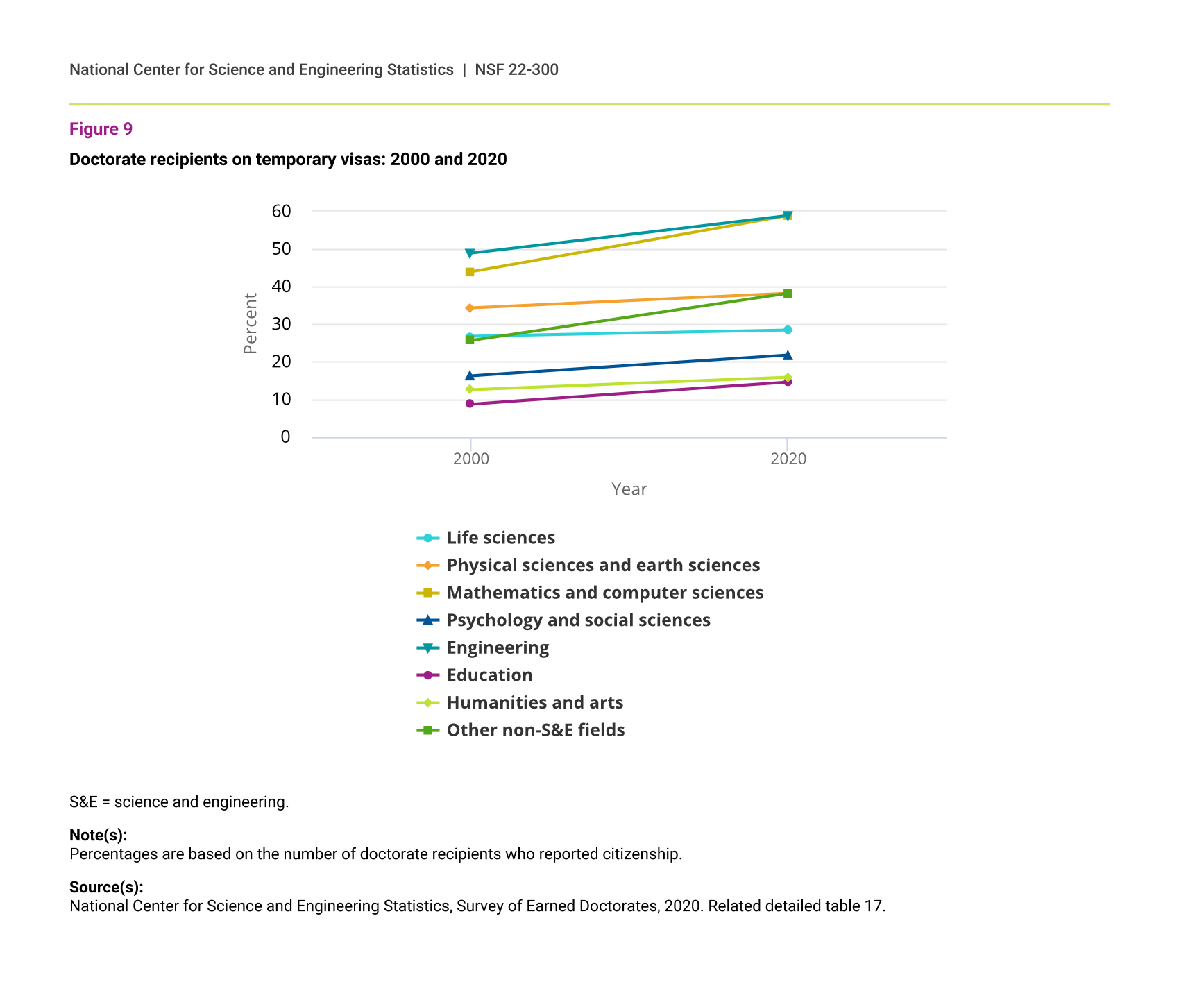 In 2020, temporary visa holders earned the majority of doctorates awarded in engineering (59%) and in mathematics and computer sciences (59%) (figure 9). Since 2000, the proportion of temporary visa holders increased the most in those two broad fields and in the category of other non-S&E fields, which includes business management and administration, communication, and other non-S&E fields not elsewhere classified.