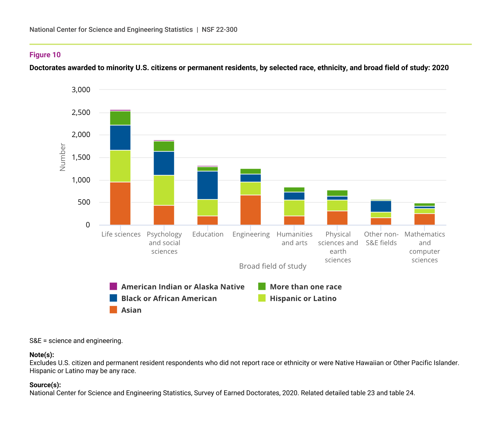Doctorates awarded to minority U.S. citizens or permanent residents, by selected race, ethnicity, and broad field of study: 2020