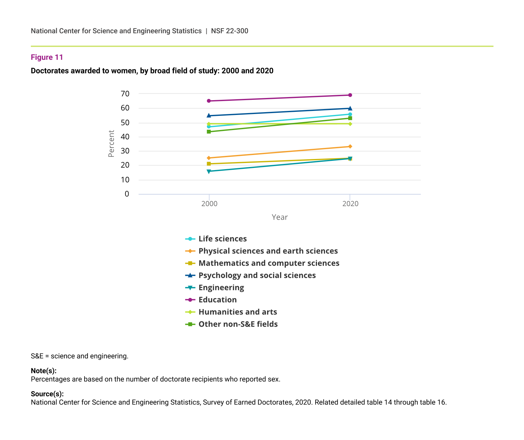 Doctorates awarded to women, by broad field of study: 2000 and 2020