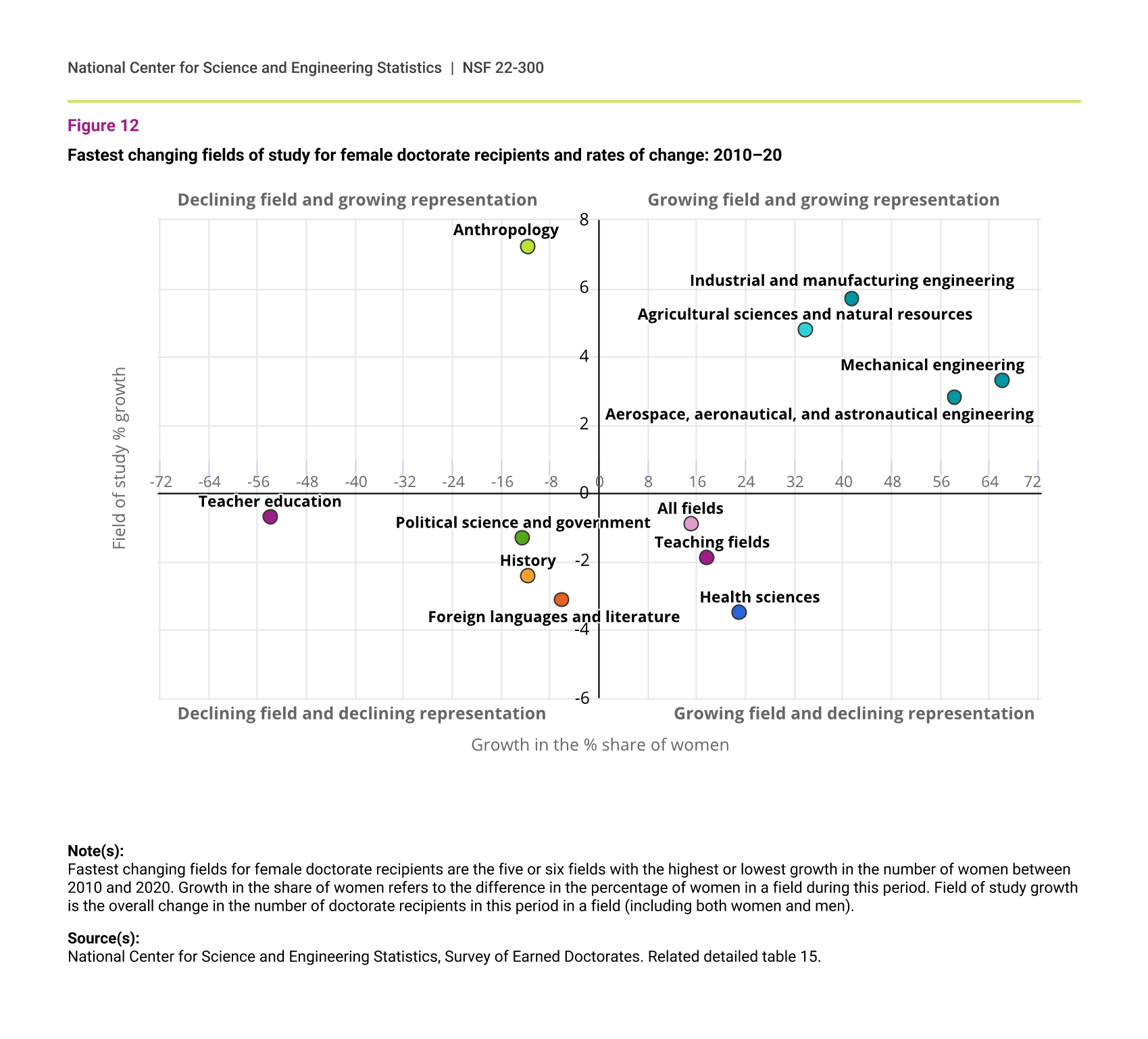 From 2010 to 2020, the proportion of female doctorate recipients increased between 3 and 6 percentage points in four fields where the overall numbers of doctorates increased: industrial and manufacturing engineering; agricultural science and natural resources; mechanical engineering; and aerospace, aeronautical, and astronautical engineering. Women’s share of doctorates also increased about 7 percentage points in anthropology, a field that declined in the overall number of doctorates awarded.