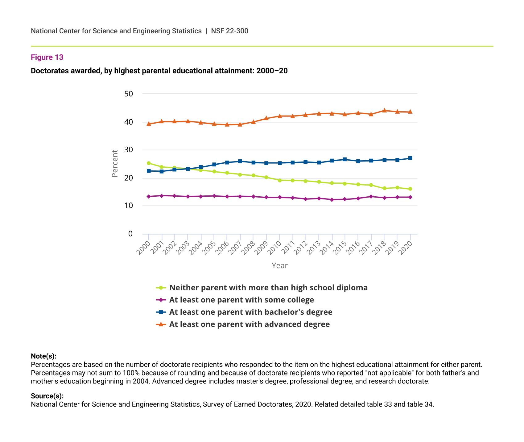 Doctorates awarded, by highest parental educational attainment: 2000–20