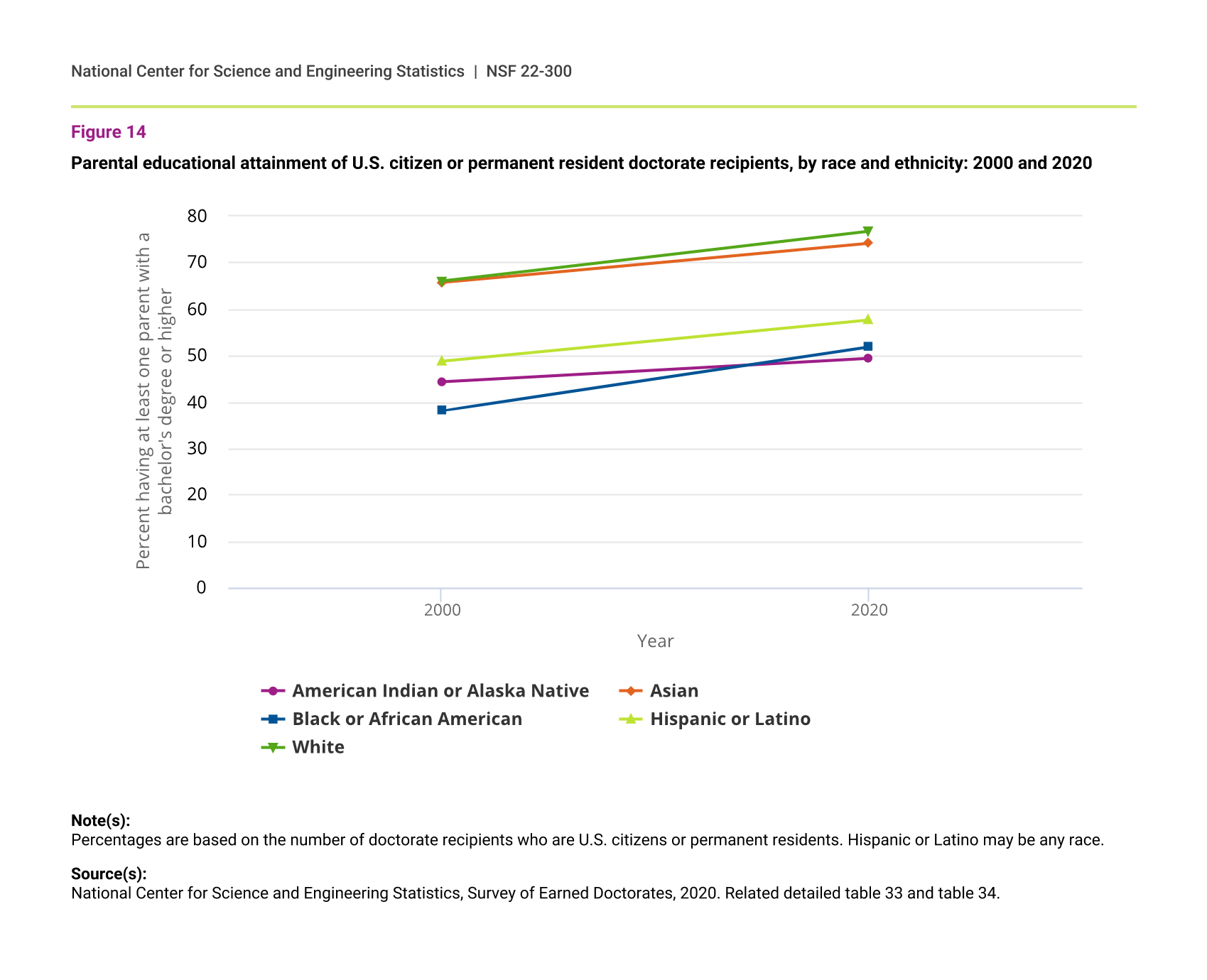 The pattern of rising parental educational attainment is visible among all races and ethnicities for doctorate recipients who are U.S. citizens or permanent residents (figure 14).