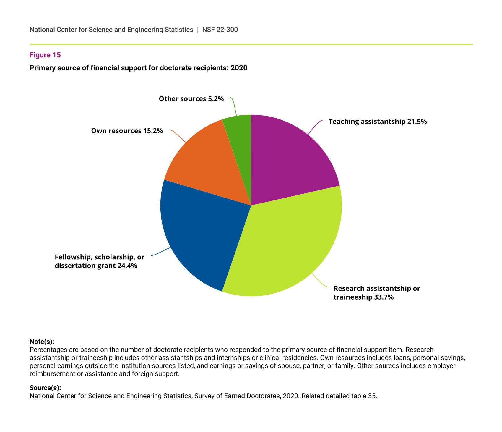 Percentages are based on the number of doctorate recipients who responded to the primary source of financial support item. Research assistantship or traineeship includes other assistantships and internships or clinical residencies. Own resources includes loans, personal savings, personal earnings outside the institution sources listed, and earnings or savings of spouse, partner, or family. Other sources includes employer reimbursement or assistance and foreign support.