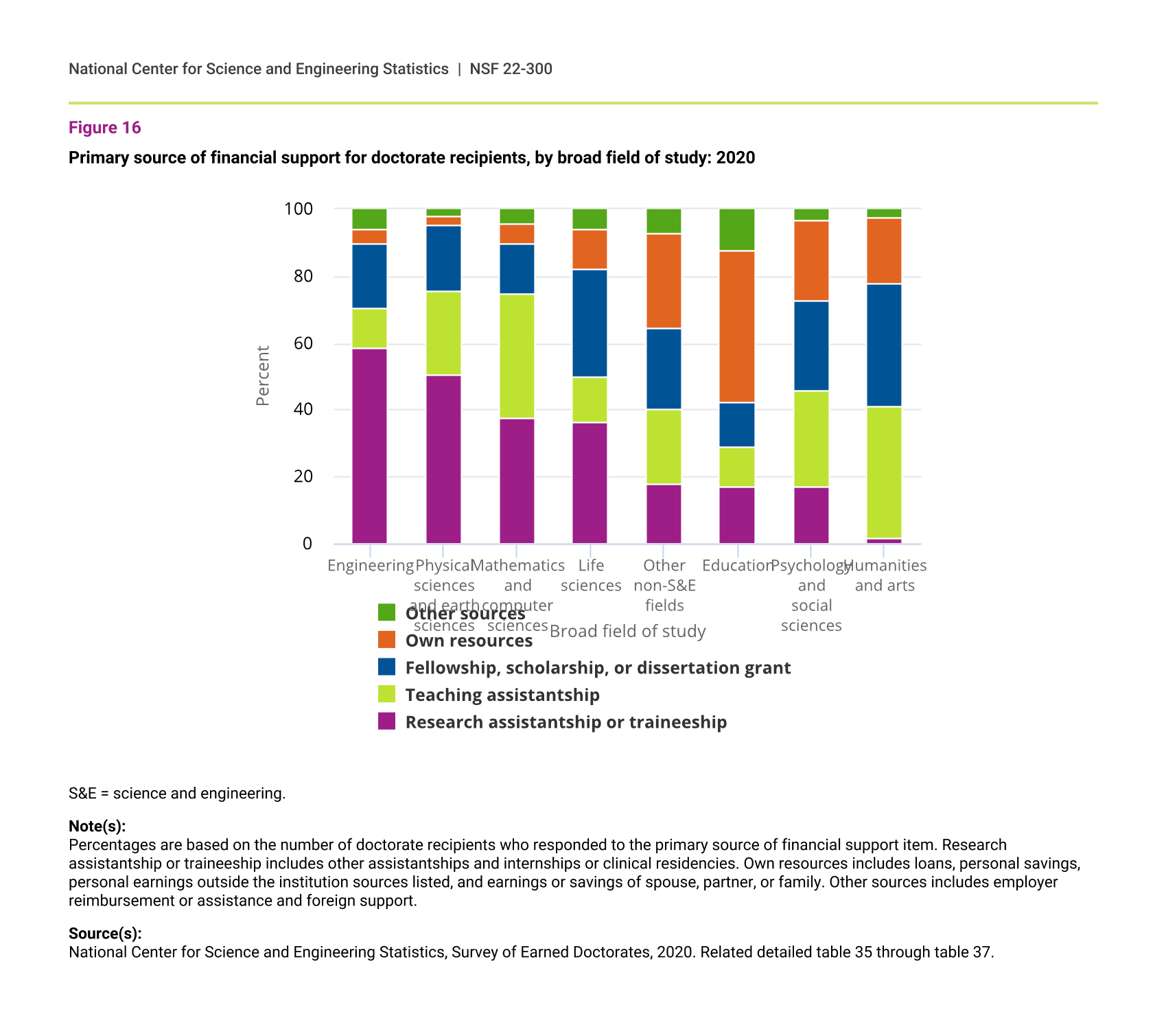 | Broad field of study | Research assistantship or traineeship | Teaching assistantship | Fellowship, scholarship, or dissertation grant | Own resources | Other sources |