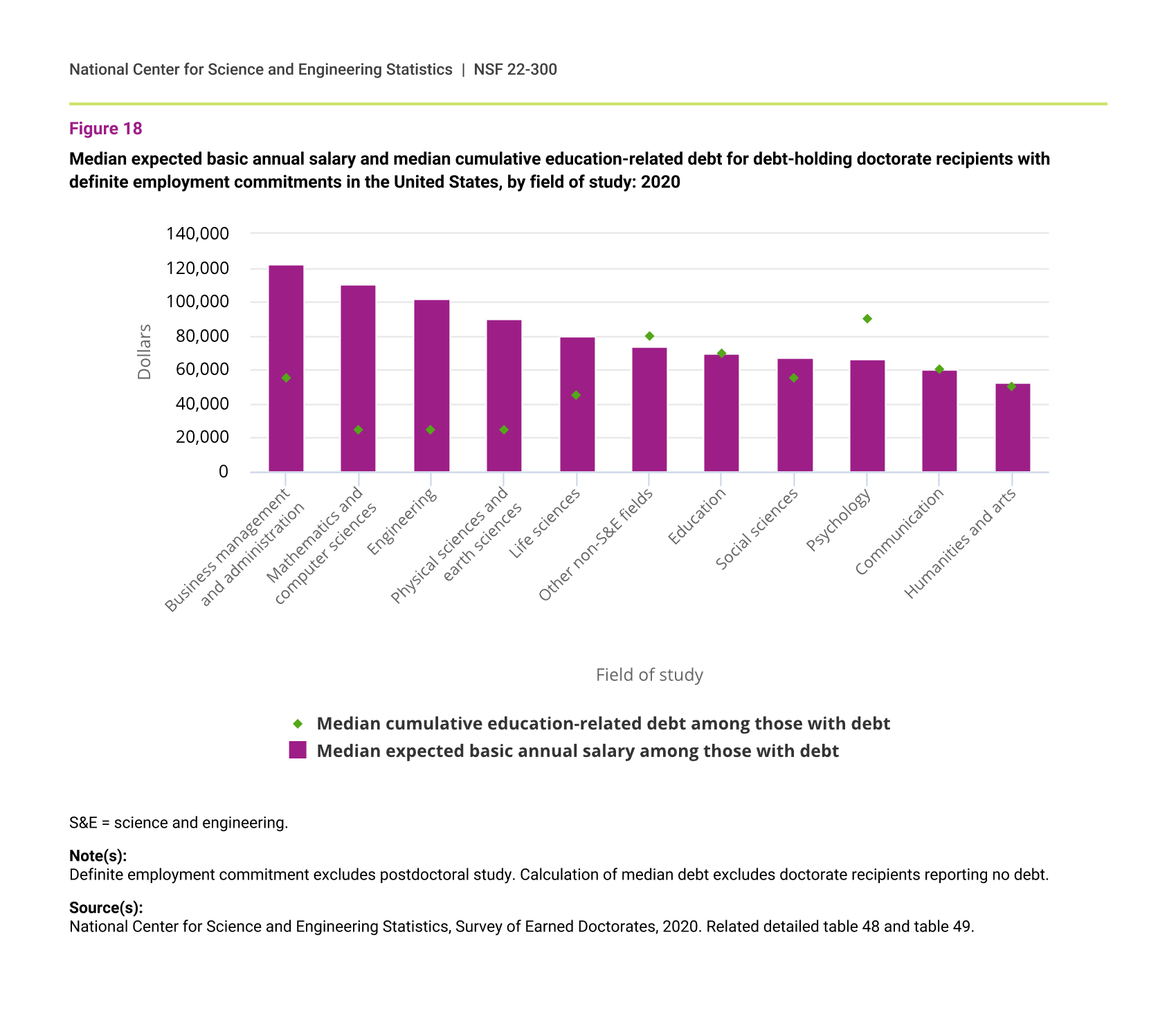 In 2020, doctorate recipients in the S&E fields with the lowest median cumulative debt—physical sciences and earth sciences, engineering, and mathematics and computer sciences—had among the highest median expected annual salaries. In these fields, median expected salaries at graduation were more than triple the median cumulative debt. Median debt among those in business management and administration was higher ($55,000), but their median expected salary was more than double their median debt (figure 18).