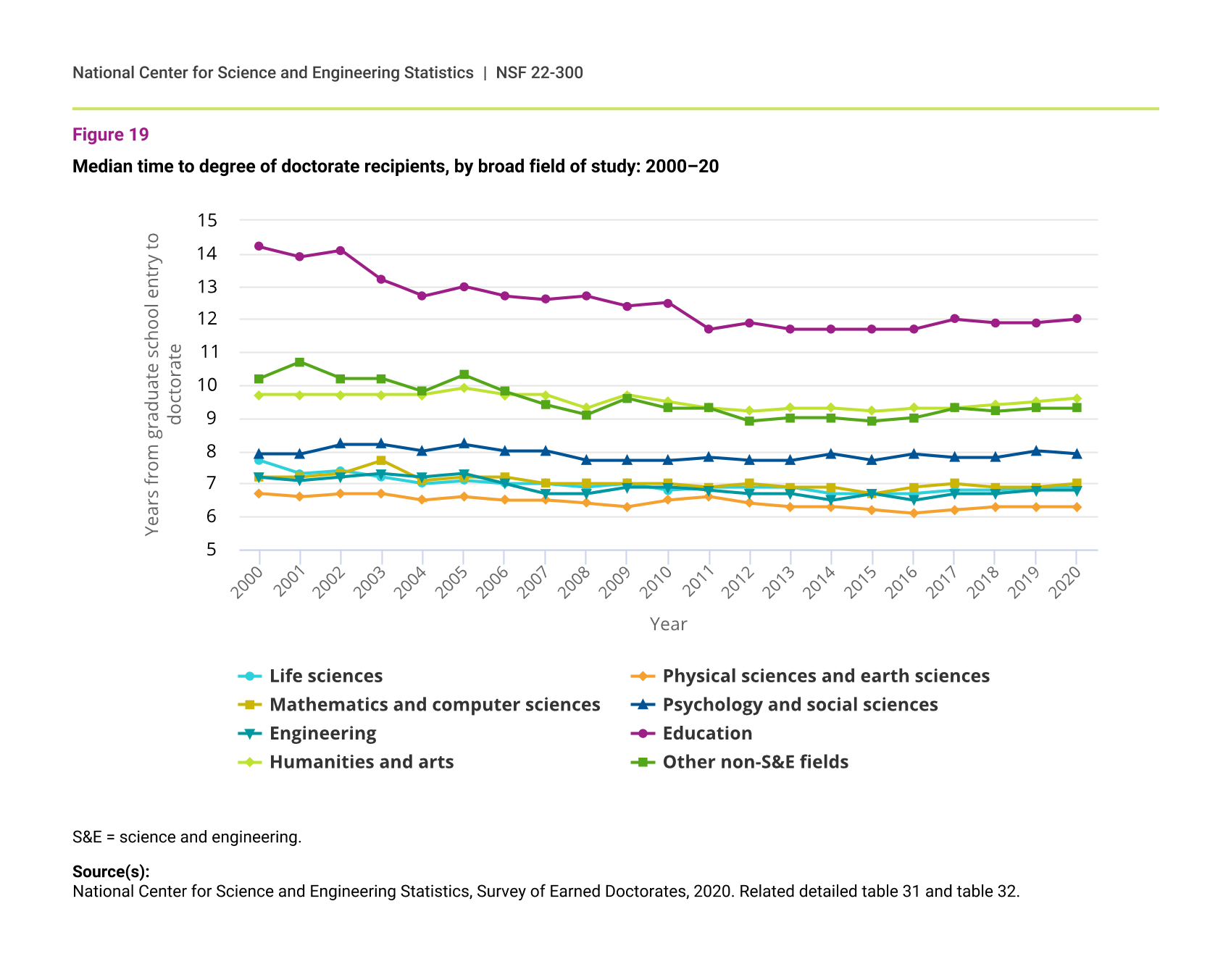 Earning a doctorate in non-S&E fields takes years longer than completing an S&E doctorate. The longest median time to degree from graduate school entry to doctoral award is in education. Over the past 20 years, median time to degree declined slightly or remained level in most S&E fields and in humanities and arts and in other non-S&E fields; it fell from 14.2 to 12.0 years in education (figure 19).