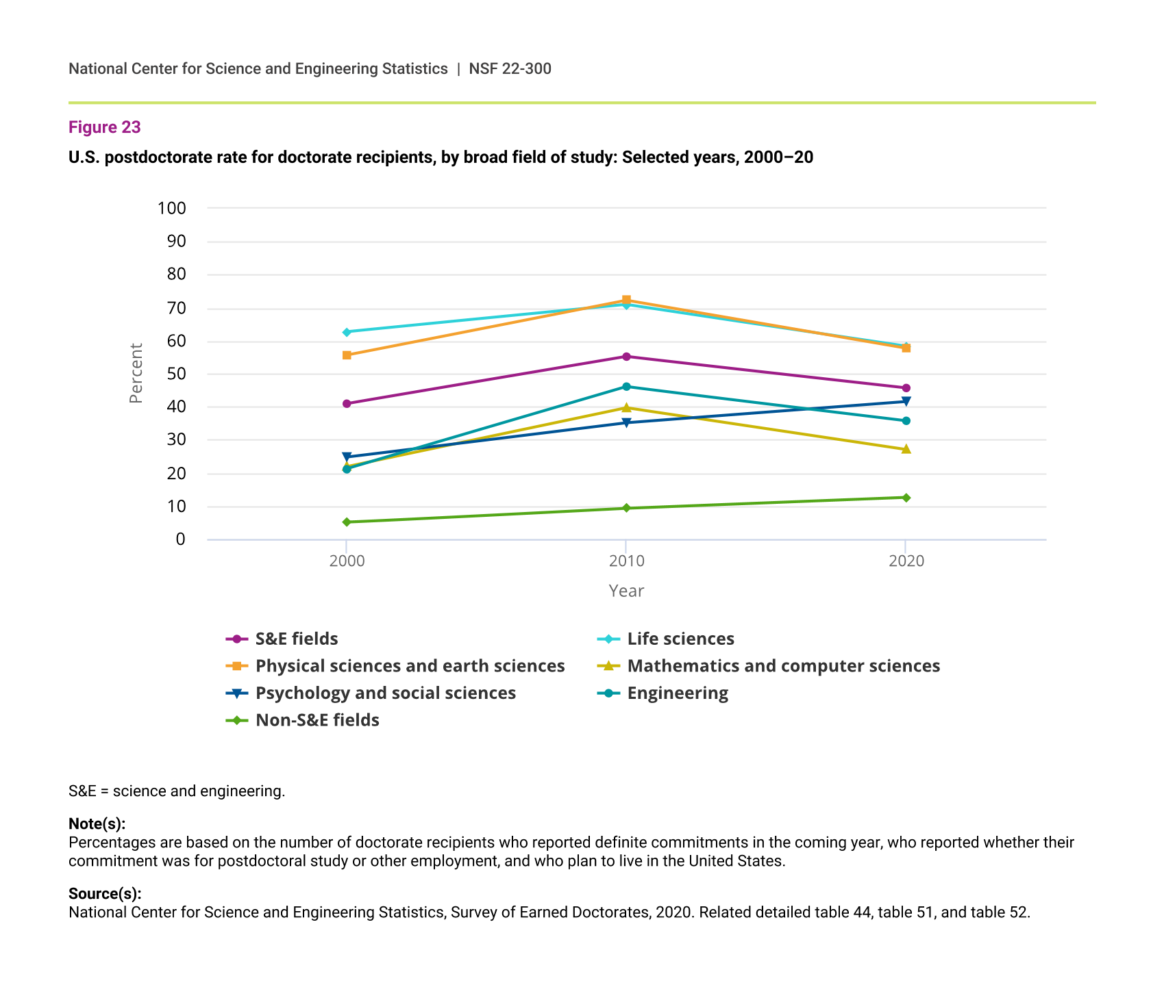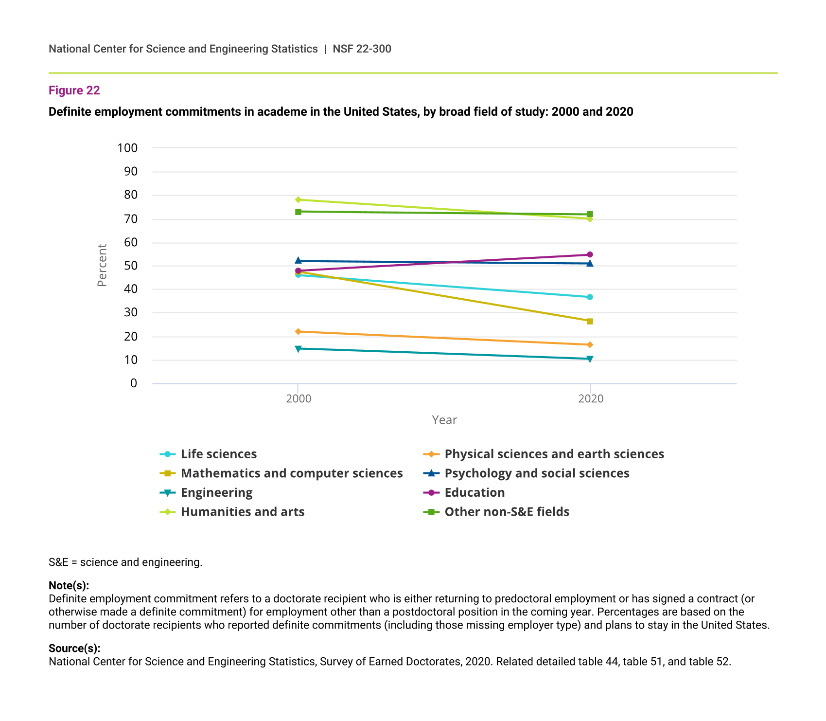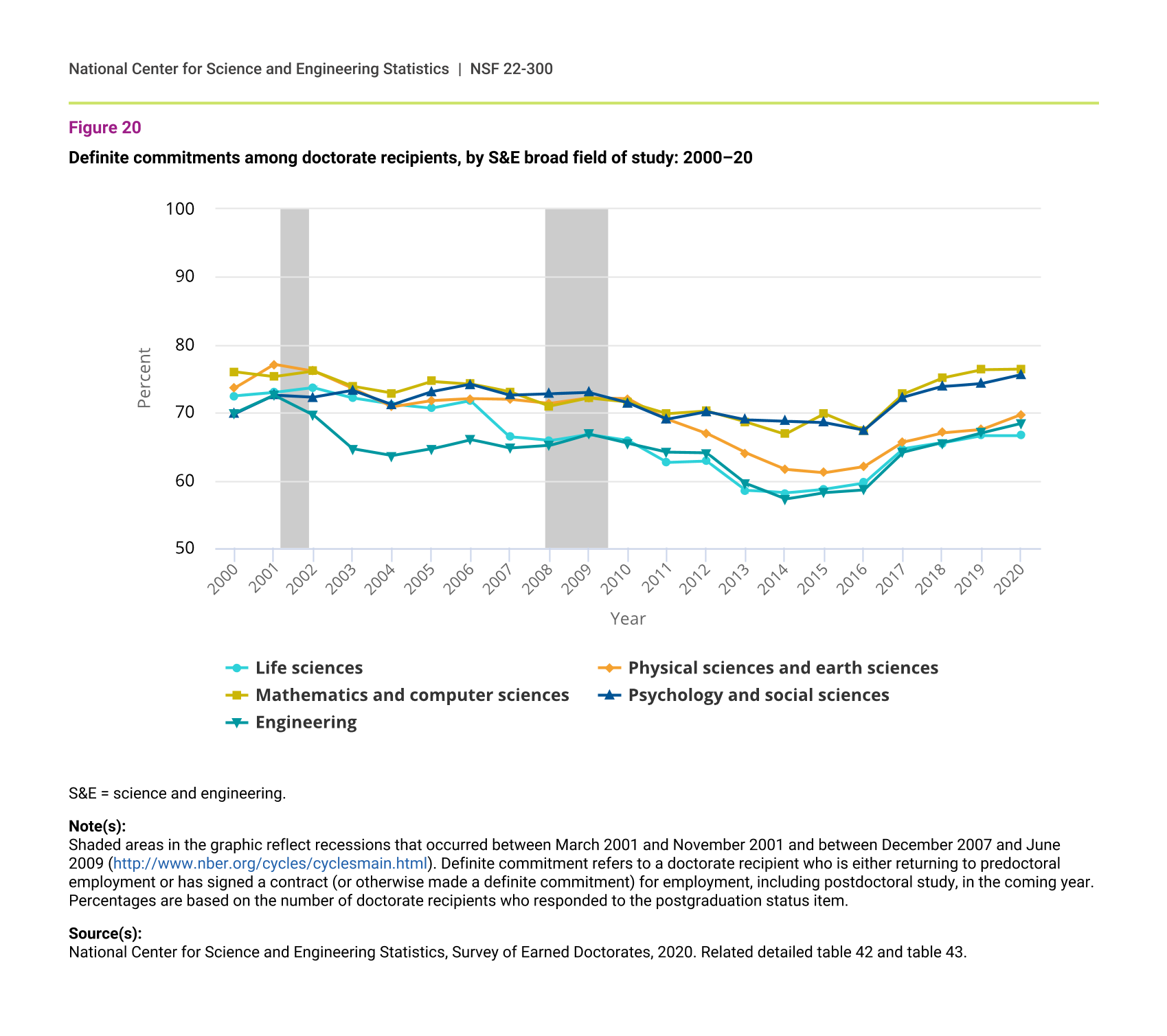 In life sciences, physical sciences and earth sciences, and engineering, the proportions of doctorate recipients reporting definite commitments, including postdoctoral positions (postdocs), have declined since 2000. These fields hit low points from about 2014 to 2016, depending on the field, but have since rebounded. In 2020, the proportion of doctorate recipients in mathematics and computer sciences and in psychology and social sciences who had definite commitments reached their highest points in the past 20 years (76% in each field) (figure 20). Non-science and engineering (non-S&E) fields similarly have recovered from lows in 2014–16 (figure 21).