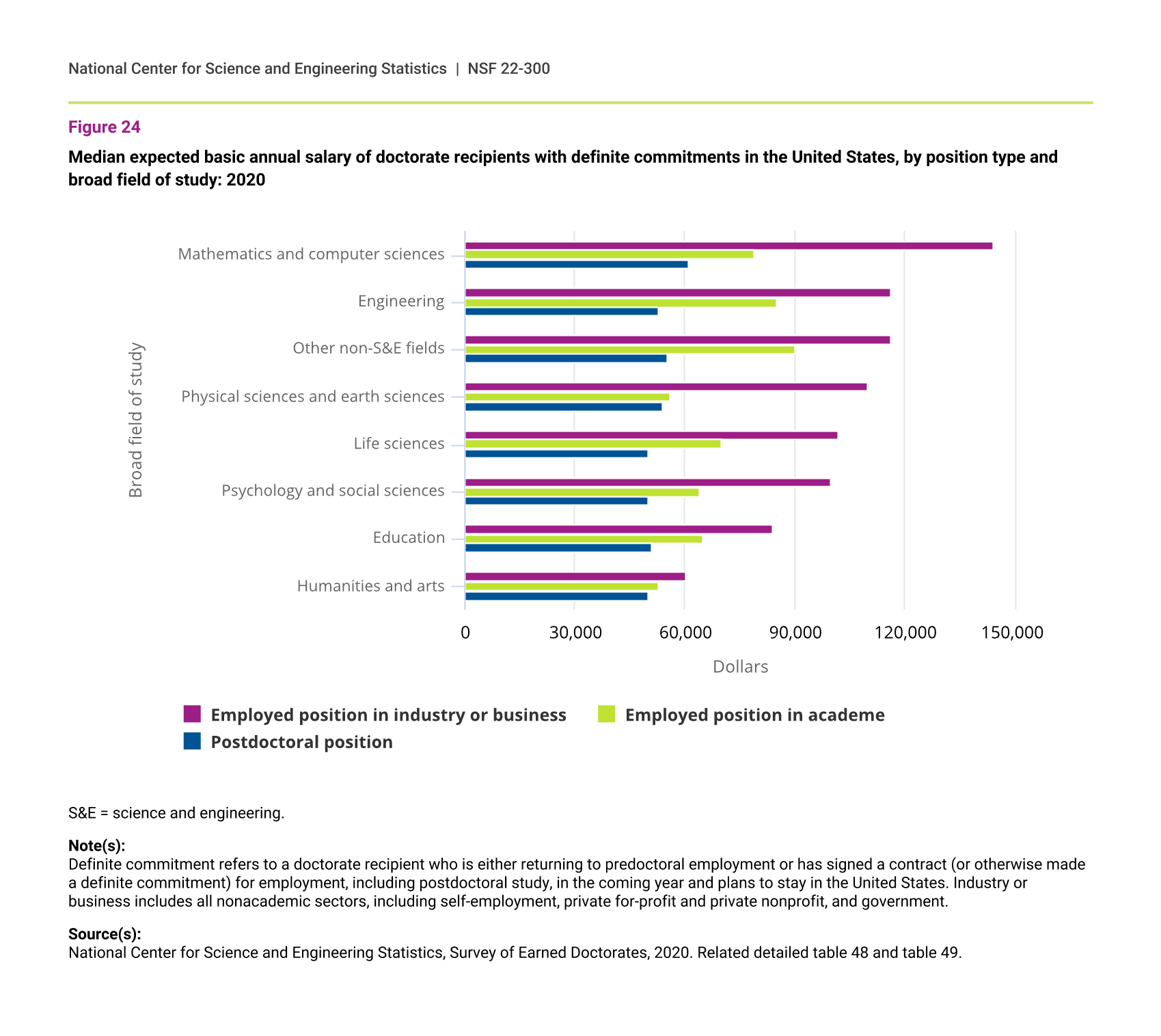 In every field, median expected salaries for doctorate recipients committing to jobs in industry or business were higher than those in postdocs and academe (figure 24). The median salaries for postdocs in almost all broad fields were relatively similar, ranging from $50,000 to $55,000. Postdocs in mathematics and computer sciences were the exception, with a median salary of $61,000. Doctorate recipients in engineering and those in other non-S&E fields, such as industry or business, reported the highest median academic salaries ($85,000 and $90,000, respectively). Those in mathematics and computer sciences reported the highest median salaries in industry or business positions ($144,000).