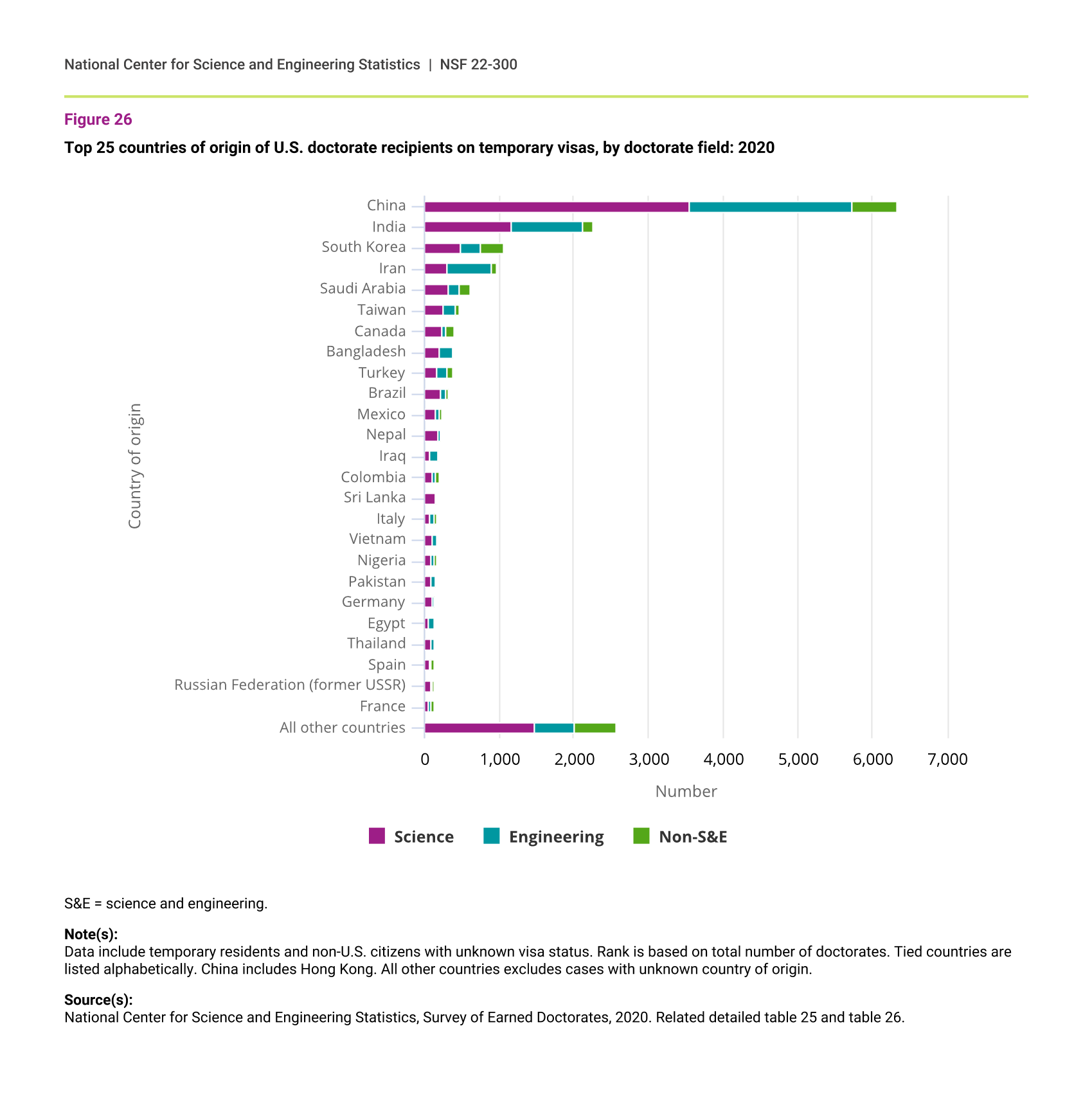 In 2020, doctorate recipients from the top 25 countries of origin accounted for 86% of all doctorate recipients awarded to temporary visa holders. The top three countries, China, India, and South Korea, accounted for more than half (figure 26).