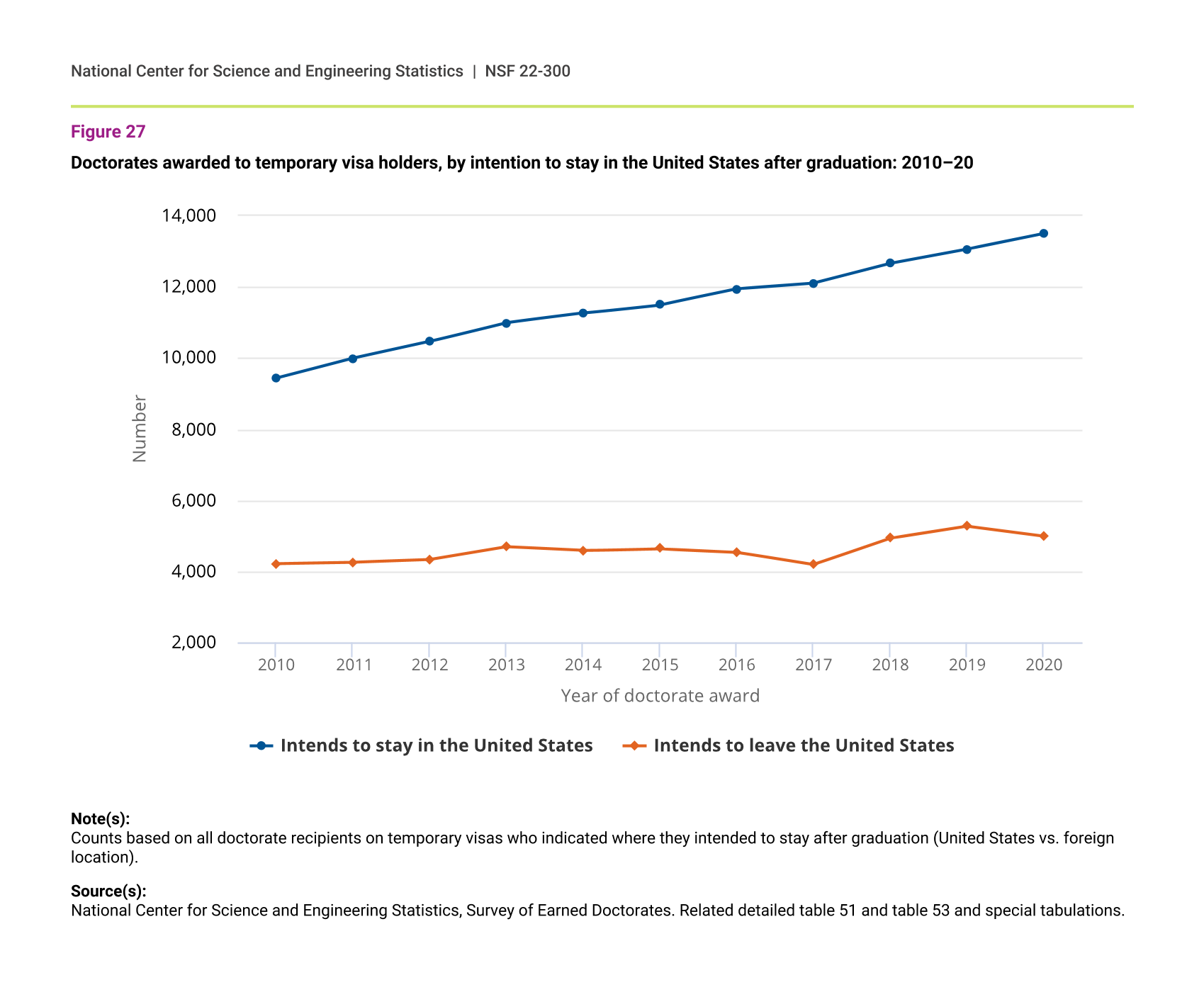 Doctorates awarded to temporary visa holders, by intention to stay in the United States after graduation: 2010–20
