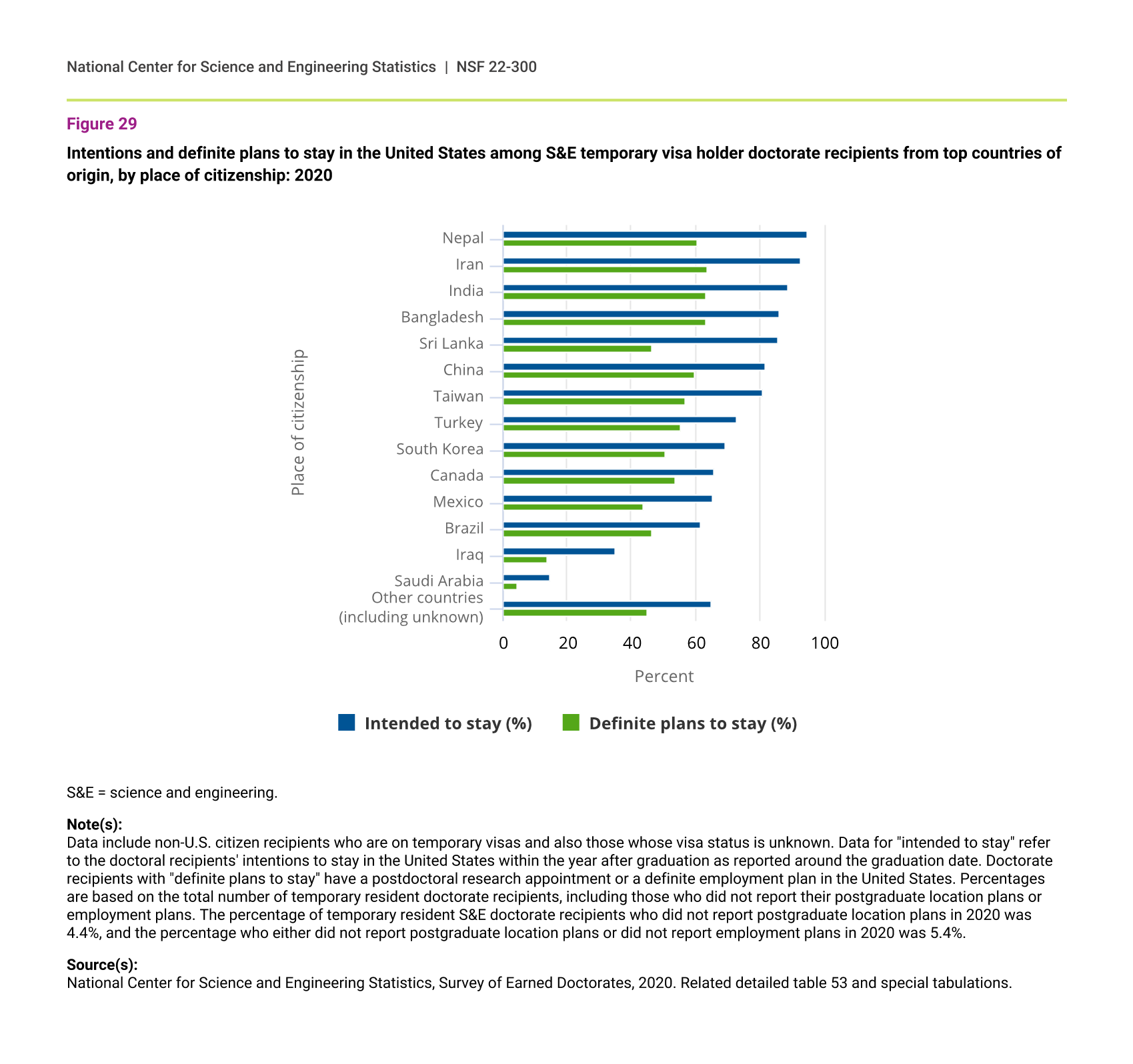 Intentions and definite plans to stay in the United States among S&E temporary visa holder doctorate recipients from top countries of origin, by place of citizenship: 2020