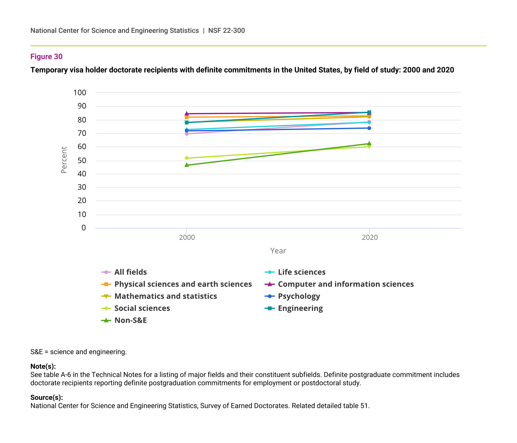 In 2020, 78% of temporary visa holder doctorate recipients with definite commitments for employment indicated that the location of their postdoc or other employment commitment was in the United States, up from 70% in 2000 (figure 30). These expected stay rates were highest in fields where temporary visa holders were more heavily represented: engineering (86%), computer and information sciences (85%), physical sciences and earth sciences (83%), and mathematics and statistics (82%).