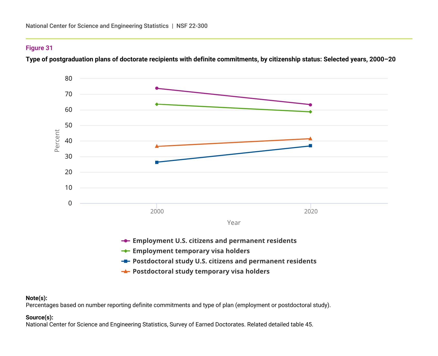 Over the past 2 decades, U.S. citizens and permanent residents have had plans for employment in non-postdoc positions at higher rates than did those on temporary visas. In contrast, temporary visa holders have had plans for postdoctoral study at higher rates than did U.S. citizens and permanent residents (figure 31). These differences narrowed over the past 20 years. In 2020, 63% of U.S. citizens and permanent residents had definite commitments for employment and 37% for postdoctoral study, compared with 59% and 41%, respectively, for their temporary visa holder counterparts.