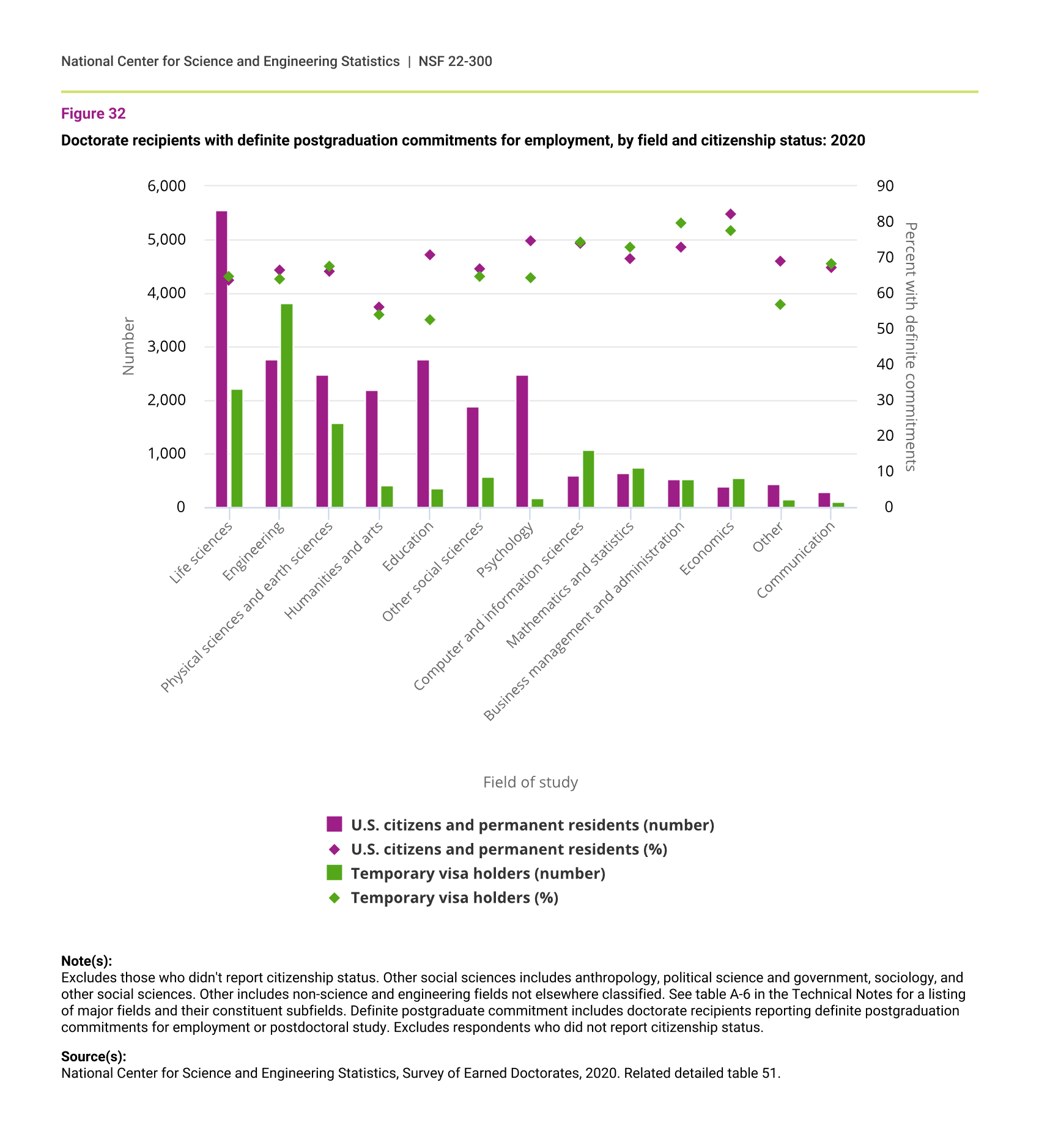 Doctorate recipients with definite postgraduation commitments for employment, by field and citizenship status: 2020