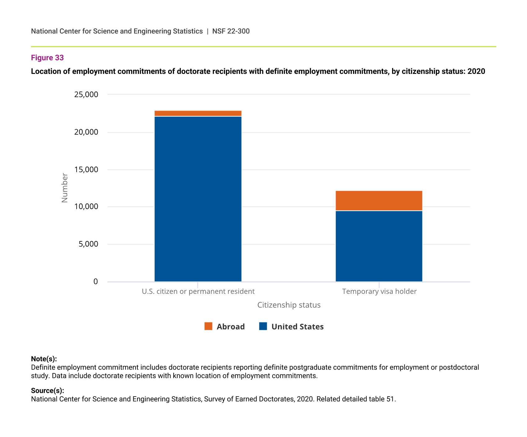 In 2020, the vast majority of U.S. citizens and permanent residents (97%) with definite employment commitments (including postdoctoral study) after graduation indicated that the job location was in the United States, compared with 78% of their temporary visa holder counterparts (figure 33).