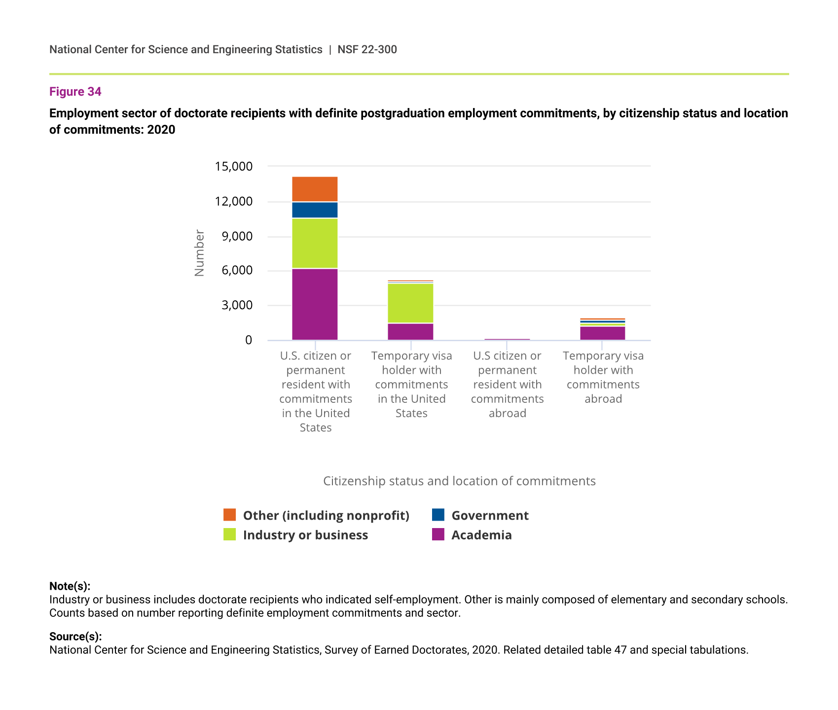 Employment sector of doctorate recipients with definite postgraduation employment commitments, by citizenship status and location of commitments: 2020