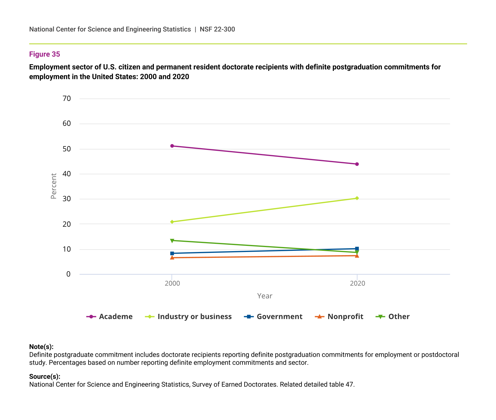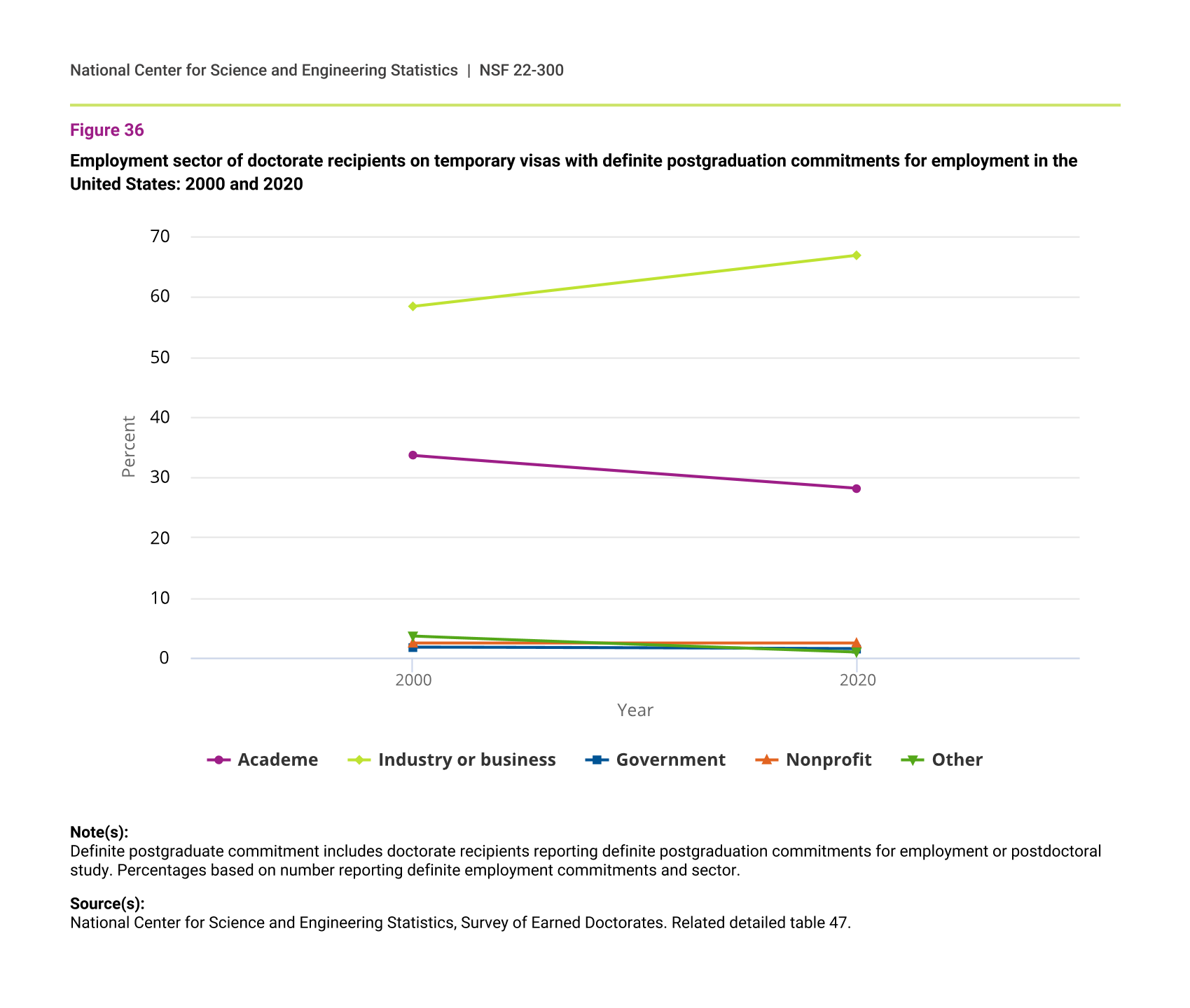 In 2020, 44% of U.S. citizens and permanent residents with definite postgraduation commitments for employment in the United States had committed to jobs in academia (down from 51% in 2000), and 30% were planning on working in industry or business (up from 21% in 2000) (figure 35). Among their temporary visa holder counterparts, 67% had lined up jobs in industry or business (up from 58% in 2000), and 28% had commitments in academia (down from 34% in 2000) (figure 36).