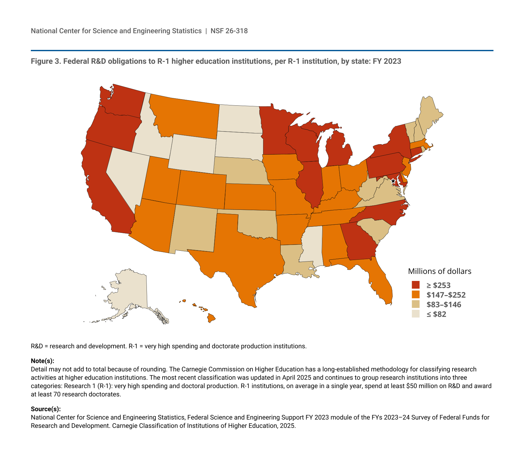 Detail may not add to total because of rounding. The Carnegie Commission on Higher Education has a long-established methodology for classifying research activities at higher education institutions. The most recent classification was updated in April 2025 and continues to group research institutions into three categories: Research 1 (R-1): very high spending and doctoral production. R-1 institutions, on average in a single year, spend at least $50 million on R&D and award at least 70 research doctorates.